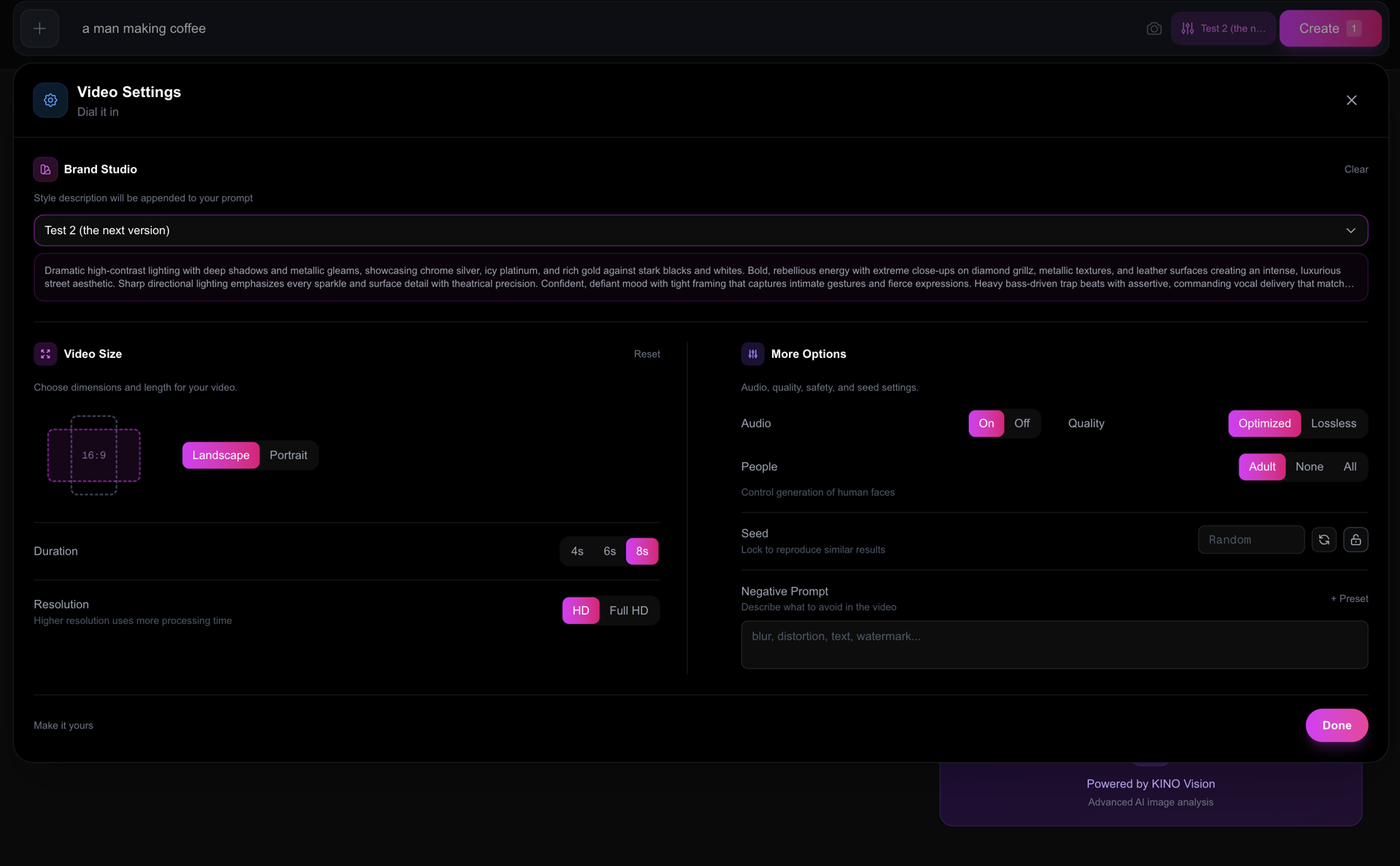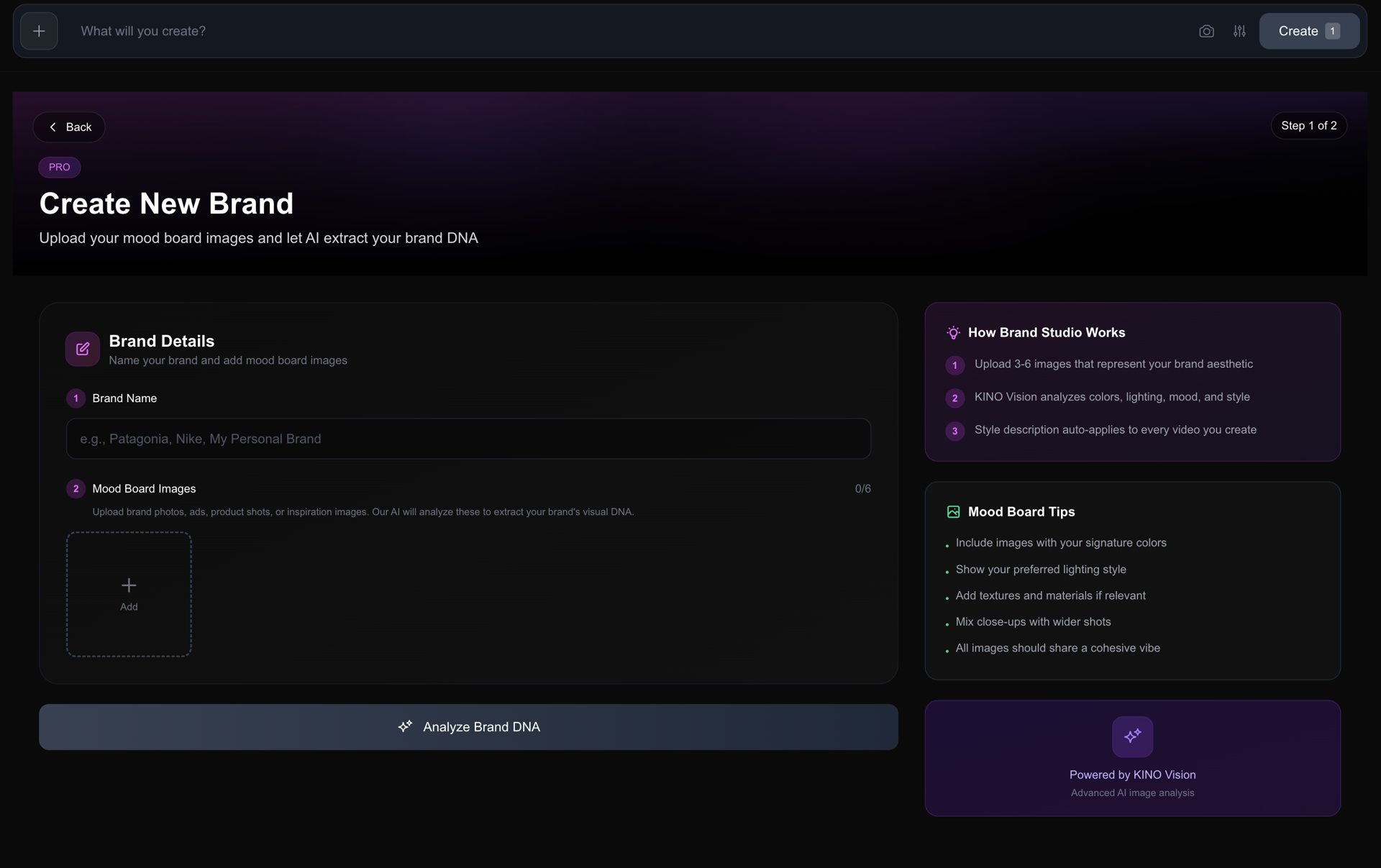 Brand Studio is your AI-powered brand consistency layer. Upload mood board images, and KINO Vision analyzes them to extract your "brand DNA" as a natural language style description that automatically applies to every video you create.